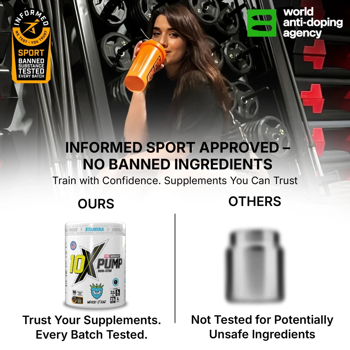 10X PUMP is a stimulant-free pre-workout designed to support muscle pumps, focus and training performance without caffeine. Ideal for evening sessions or for anyone who prefers a non-stimulant formula. This product is Informed-Sport tested and manufactured in GMP-certified facilities for quality and assurance.