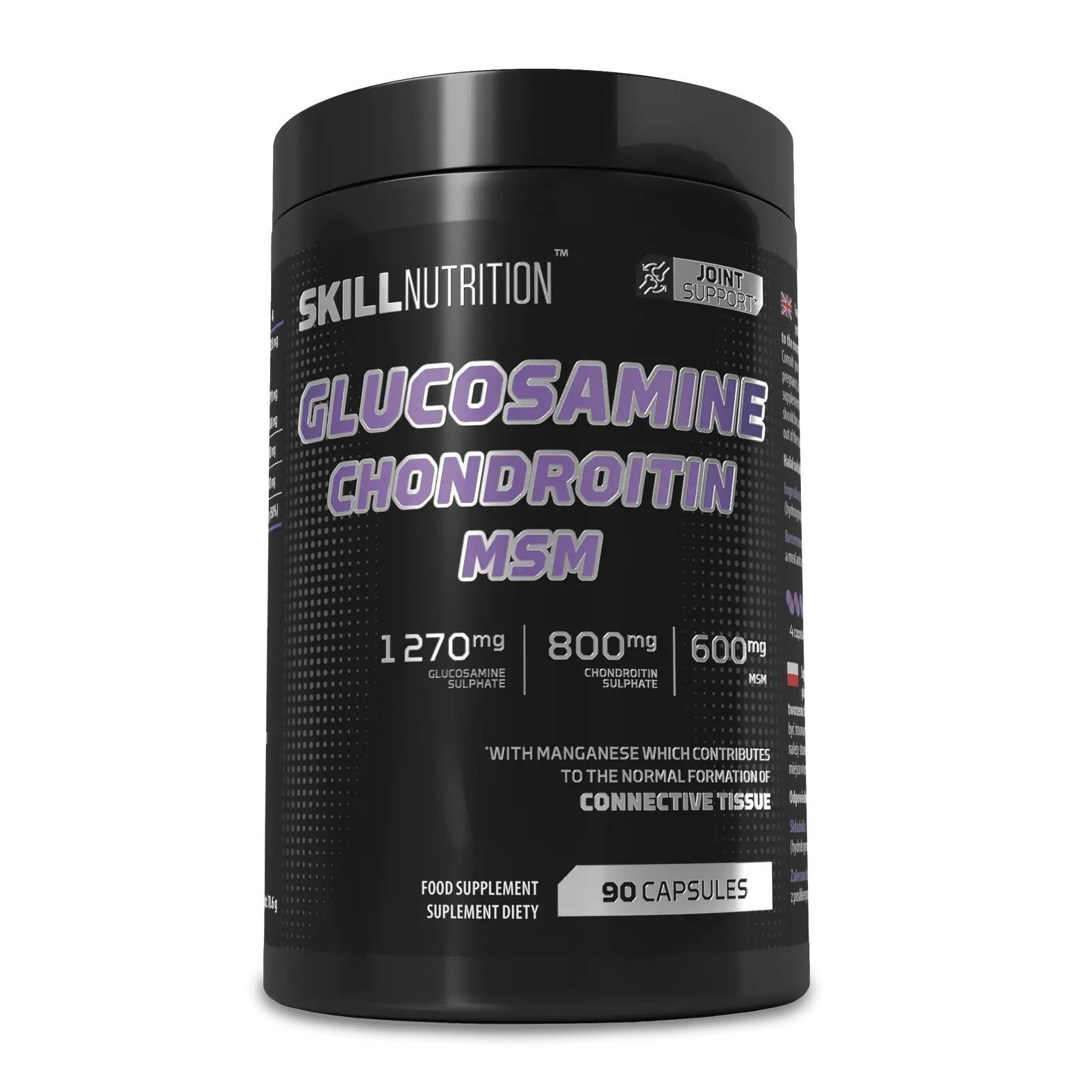 SkillNutrition Glucosamine + Chondroitin + MSM is a food supplement formulated for adults who wish to support daily nutrition as part of a balanced diet and healthy lifestyle. It combines glucosamine sulphate, chondroitin sulphate, MSM (methylsulfonylmethane) and manganese in a convenient capsule format.
