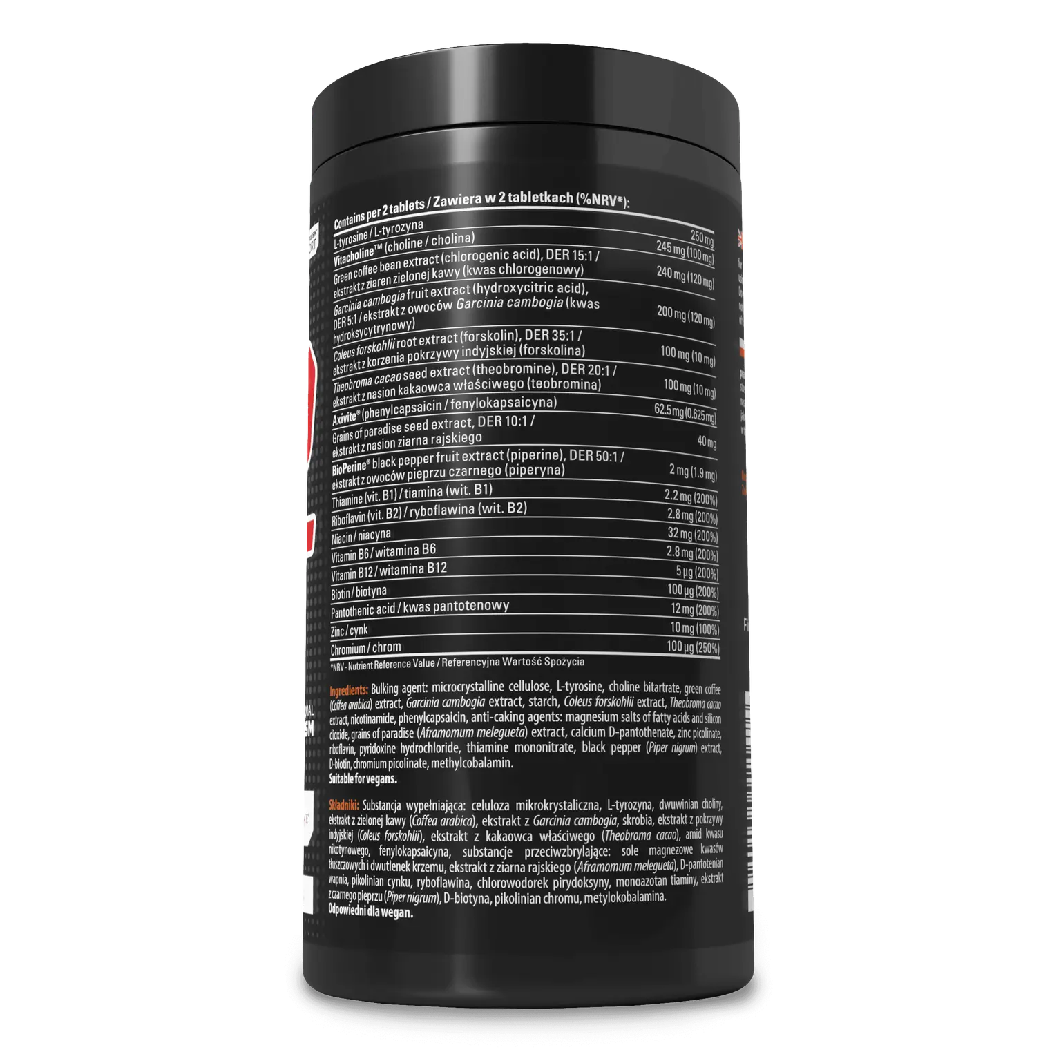 Bulking agent (microcrystalline cellulose), L-tyrosine, choline bitartrate, green coffee extract, Garcinia cambogia extract, starch, Coleus forskohlii extract, Theobroma cacao extract, nicotinamide, phenylcapsaicin, anti-caking agents (magnesium salts of fatty acids, silicon dioxide), grains of paradise extract, calcium D-pantothenate, zinc picolinate, riboflavin, pyridoxine hydrochloride, thiamine mononitrate, black pepper extract, D-biotin, chromium picolinate, methylcobalamin.