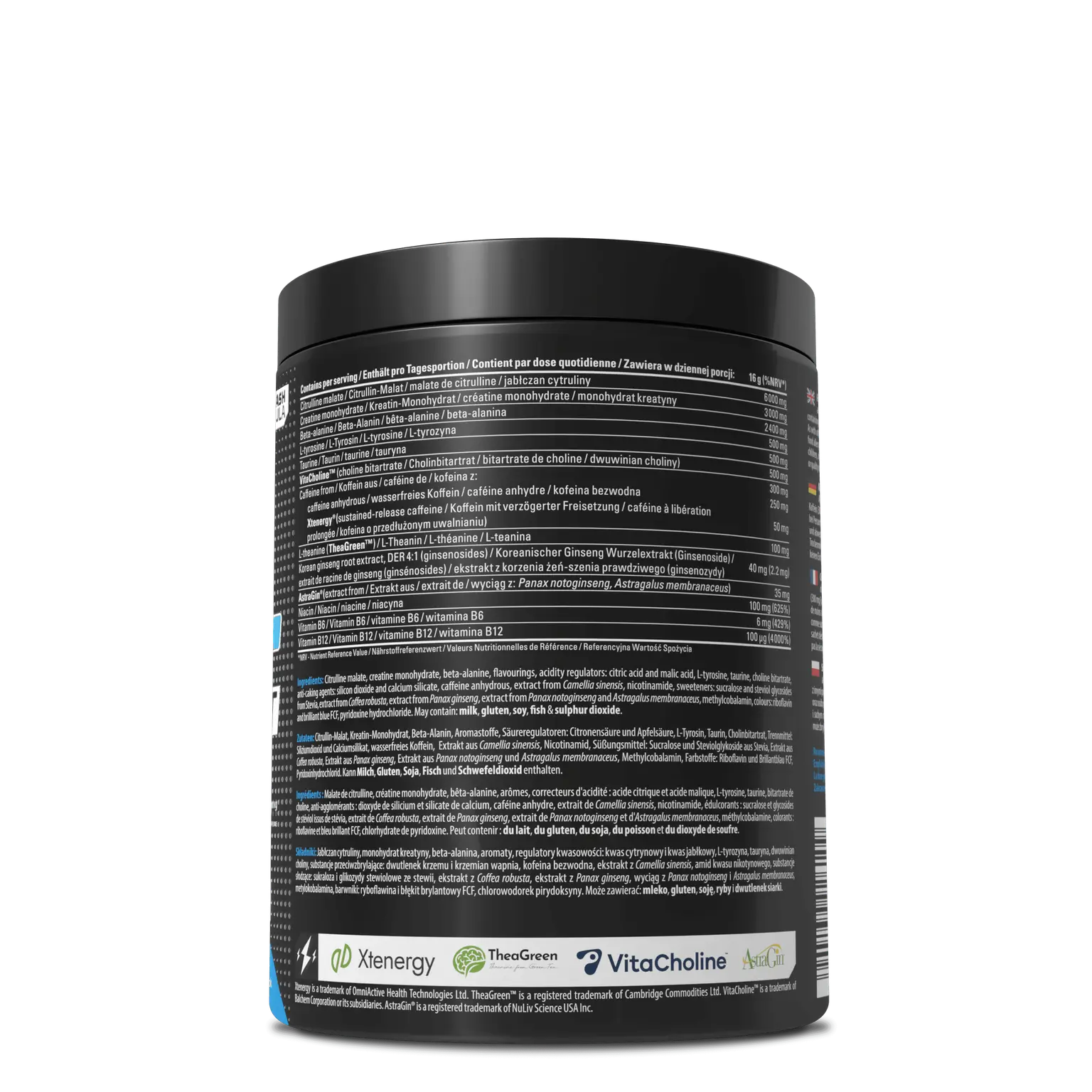 Citrulline malate, creatine monohydrate, beta-alanine, flavourings, acidity regulators (citric acid, malic acid), L-tyrosine, taurine, choline bitartrate, anti-caking agents (silicon dioxide, calcium silicate), caffeine anhydrous, extract from Camellia sinensis, nicotinamide, sweeteners (sucralose, steviol glycosides from Stevia), extract from Coffea robusta, extract from Panax ginseng, extract from Panax notoginseng and Astragalus membranaceus, methylcobalamin, colours (riboflavin, brilliant blue FCF), pyridoxine hydrochloride.