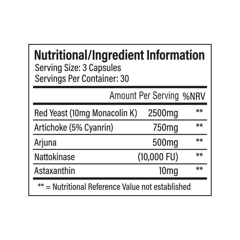 Red Yeast Rice, Artichoke Extract (5% Cynarin), Arjuna, Nattokinase, Astaxanthin, Silicon Dioxide, Hydroxypropyl Methylcellulose (HPMC Capsule), Maltodextrin, Magnesium Stearate.